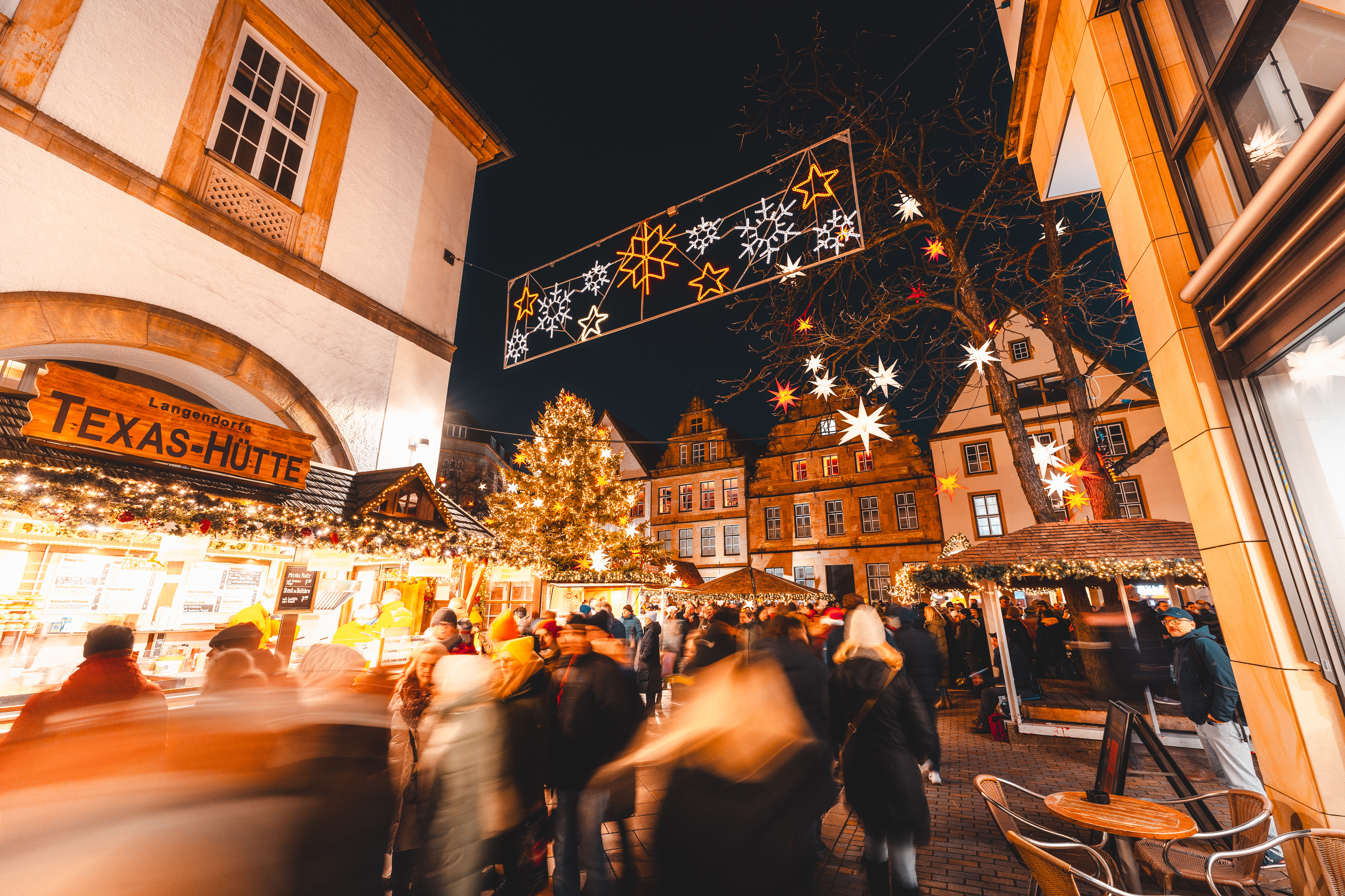 Für viele ist es die schönste Zeit im Jahr, wenn endlich wieder Weihnachtsmusik erklingt, geschmückte Tannenbäume leuchten und der Duft von Glühwein und gebrannten Mandeln durch die Straßen zieht. Zu erleben ist dies alles auf dem Bielefelder Weihnachtsmarkt, der zu den größten in Nordrhein-Westfalen zählt. In mehr als 110 liebevoll dekorierten Häuschen gibt es ein breites Angebot an Kunsthandwerk und winterlichen Leckereien zu entdecken, und nostalgische Karussells bringen Kinderaugen zum Leuchten. Auch in diesem Jahr wird wieder für jeden etwas dabei sein – zwischen dem stimmungsvollen Alten Markt im Herzen der Altstadt, dem rustikalen „Haus vom Nikolaus“ im Altstädter Kirchpark, dem charmanten Hüttendorf auf dem Jahnplatz mit der größten Weihnachtspyramide Nordrhein-Westfalens, den beliebten Glühweinständen in der Bahnhofstraße und dem geselligen Eisstockschießen auf dem Klosterplatz.