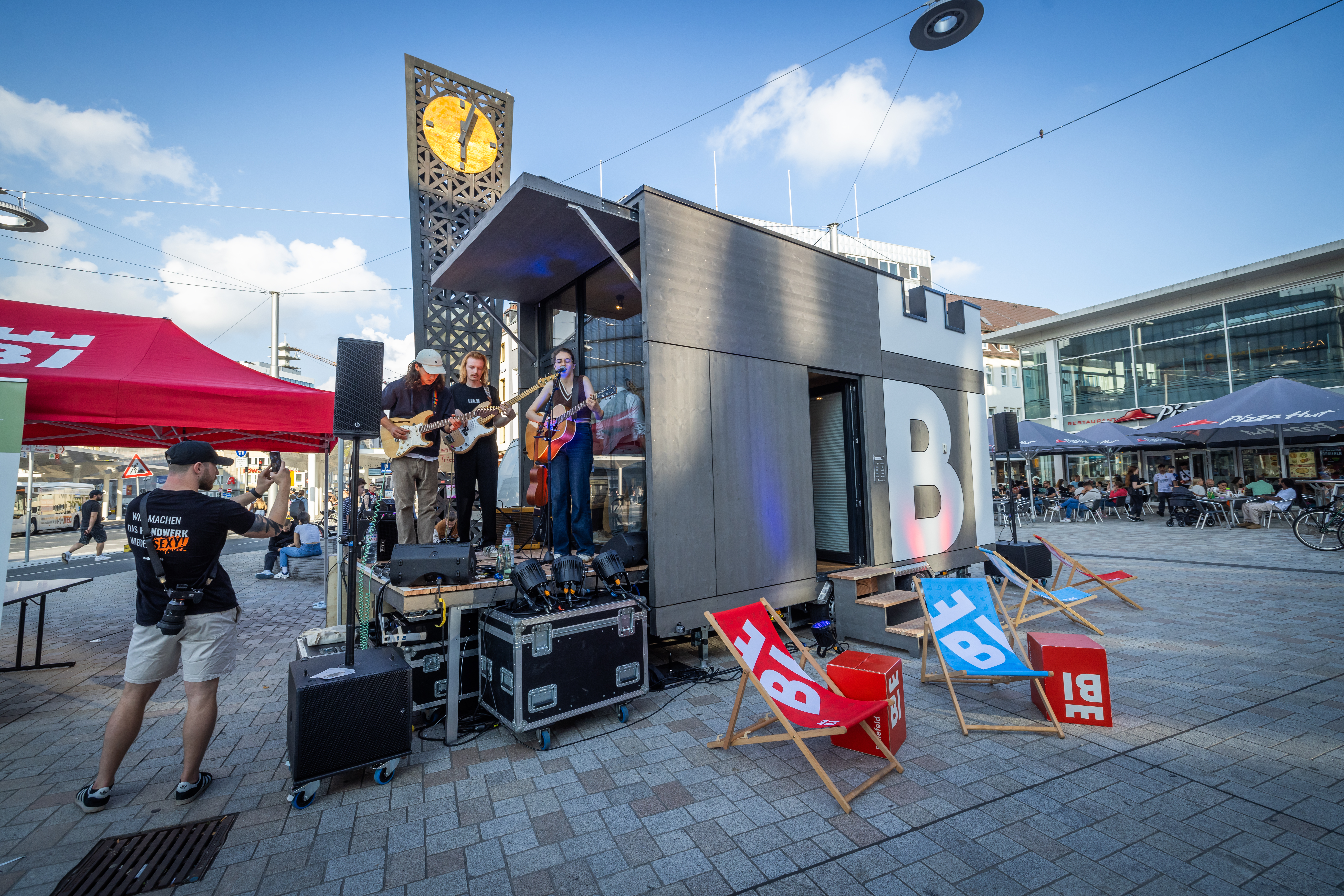 Am 2. September 2023, gegen 17.30 Uhr, war es so weit: Auf dem Bielefelder Jahnplatz wurde tu:bie feierlich enthüllt. Mit dem neuen mobilen Erlebnisraum für die Innenstadt möchte die Bielefeld Marketing GmbH langfristig für neue Besuchsanlässe in der City sorgen. Von Live-Musik und DJ-Sessions über Streetfood bis zu Lesungen und Kinderschminken – der variable Veranstaltungsraum auf Rädern ermöglicht unterschiedlichste City-Erlebnisse, die die Bielefelder Innenstadt noch attraktiver machen. Das tu:bie-Mobil entstand als eine Gemeinschaftsleistung des Bielefelder Stadtmarketings und zahlreicher Unternehmen und Institutionen, die sich im Rahmen der Bielefeld-Partnerschaft für die Stadtmarke und das Image unserer Stadt engagieren.