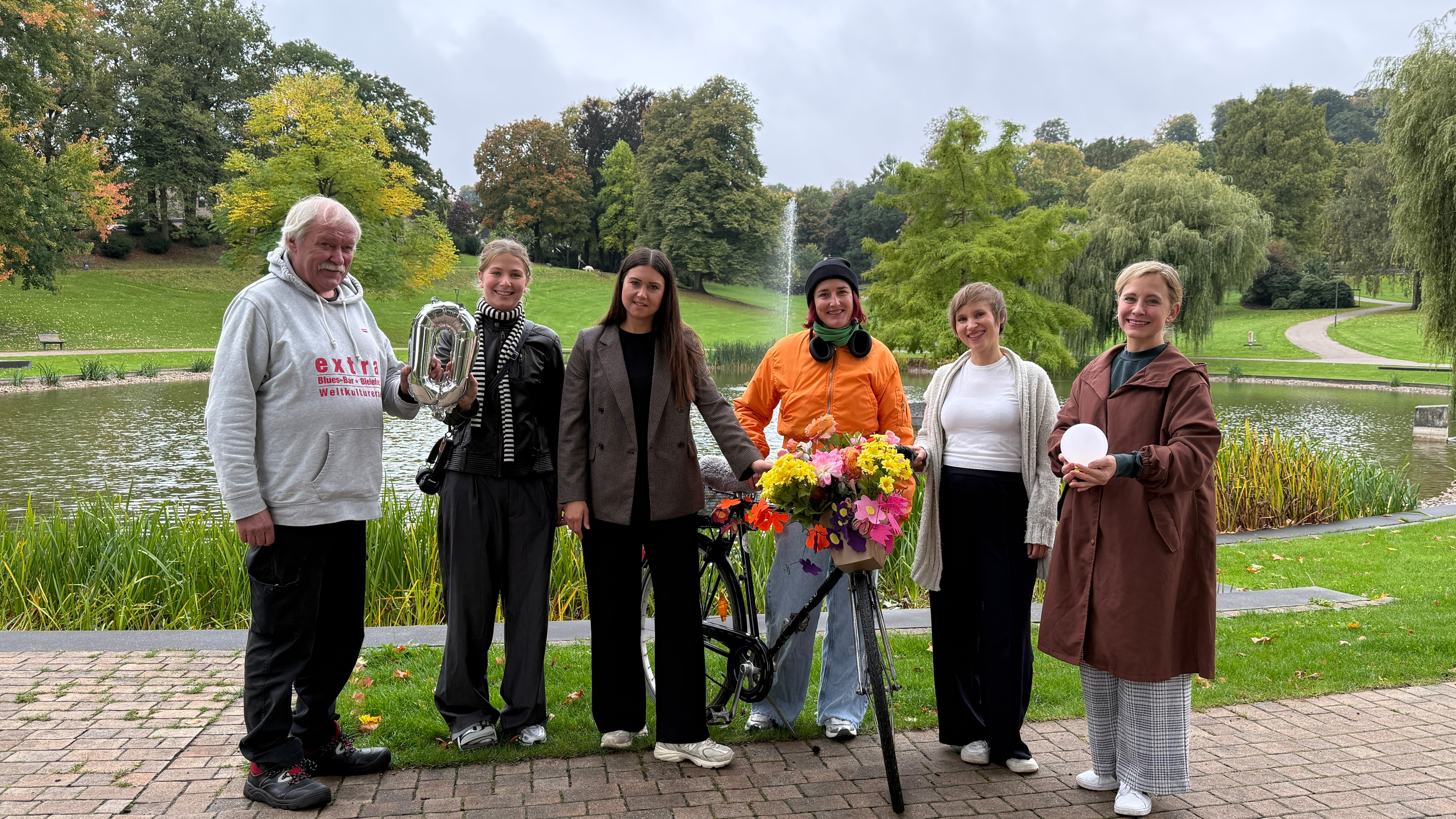 Im Bürgerpark gratuliert Nadine Connor (Bielefeld Marketing, 3. v. l.) den Gewinnern der Fan-Aktion 2025: (v. l.) Winfried Motzkus (Blues Bar e. V.), Greta Lohrenz (Bunker Ulmenwall e. V.), Streetart-Künstlerin MARLA, Friederike Meißner (Historisches Museum Bielefeld) und Musicaldarstellerin Alina Meinold.
