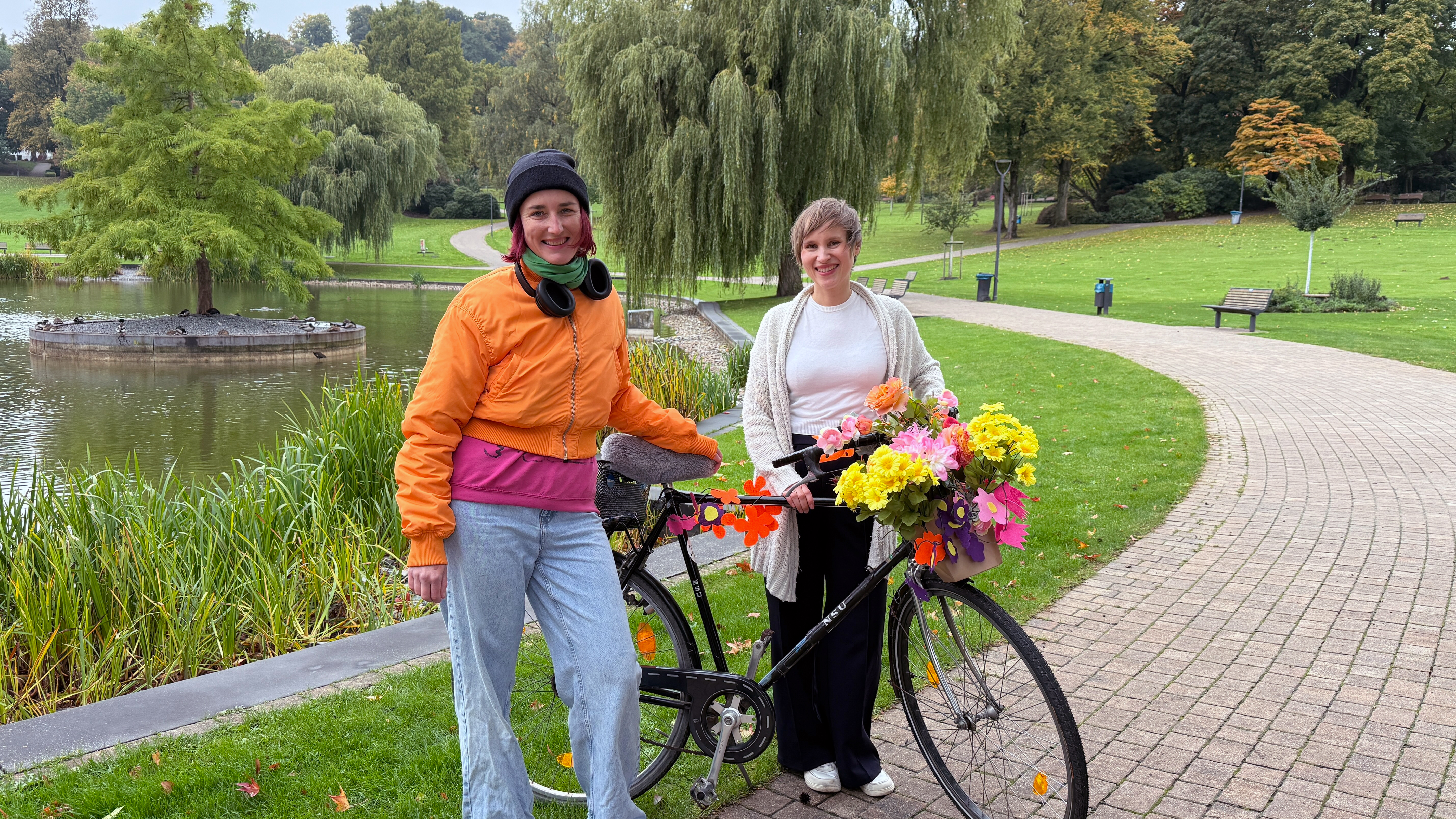 „Klima meets Geschichte – bunte Fahrradstadt Bielefeld“: Die Streetart-Künstlerin MARLA (l.) und Friederike Meißner vom Historischen Museum Bielefeld verwandeln alte Fahrräder in Kunstobjekte.