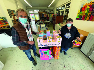 Künstlerin Susanne Hadamitzky (r.) und Jürgen Heinrich, Leiter des Künstlerhauses Lydda, zeigen das bunt gestaltete "Bethel-BIE".