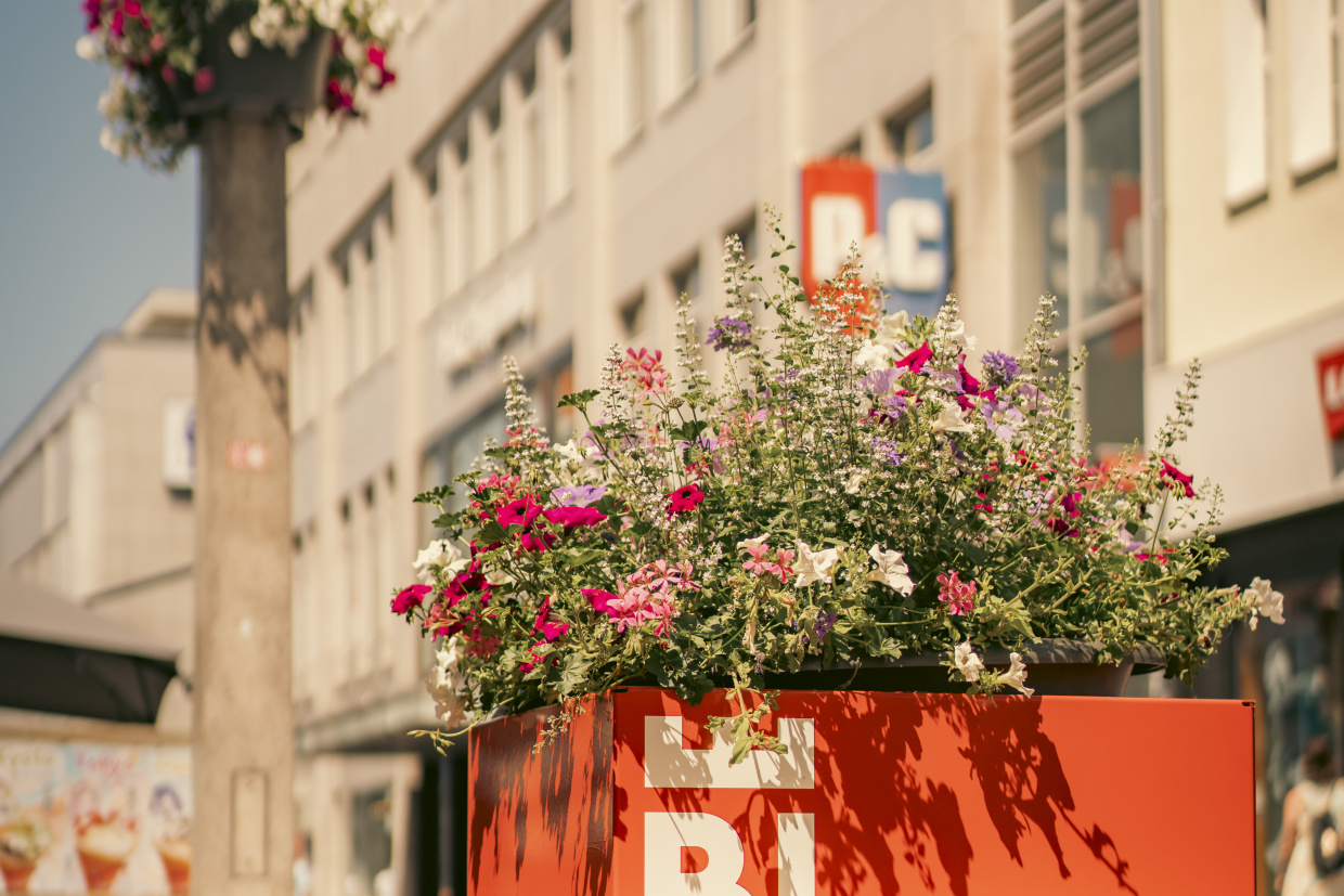 Für mehr Aufenthaltsqualität in der Innenstadt sorgen große saisonal bepflanzte Blumentöpfe und Blumenampeln, die entlang der Fußgängerzone aufgestellt sind. Die bienenfreundlichen Arrangements verbessern das Stadtklima und wirken sich positiv auf Mensch, Tier und Umwelt aus.